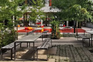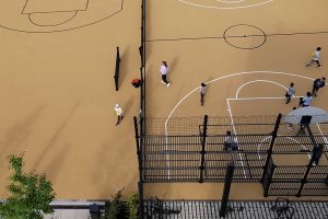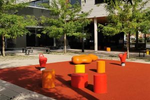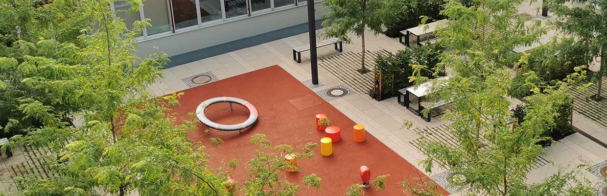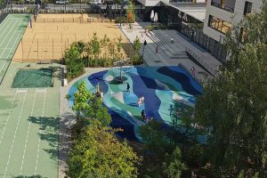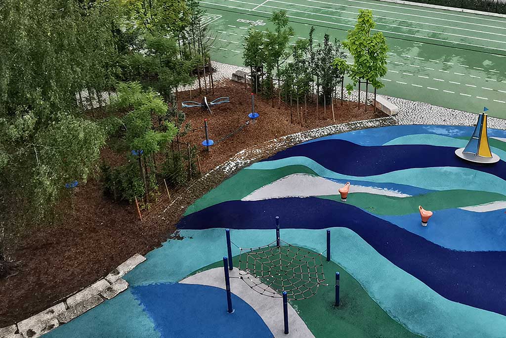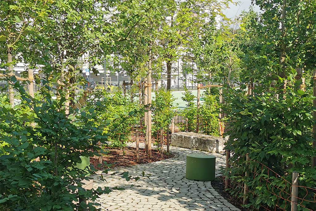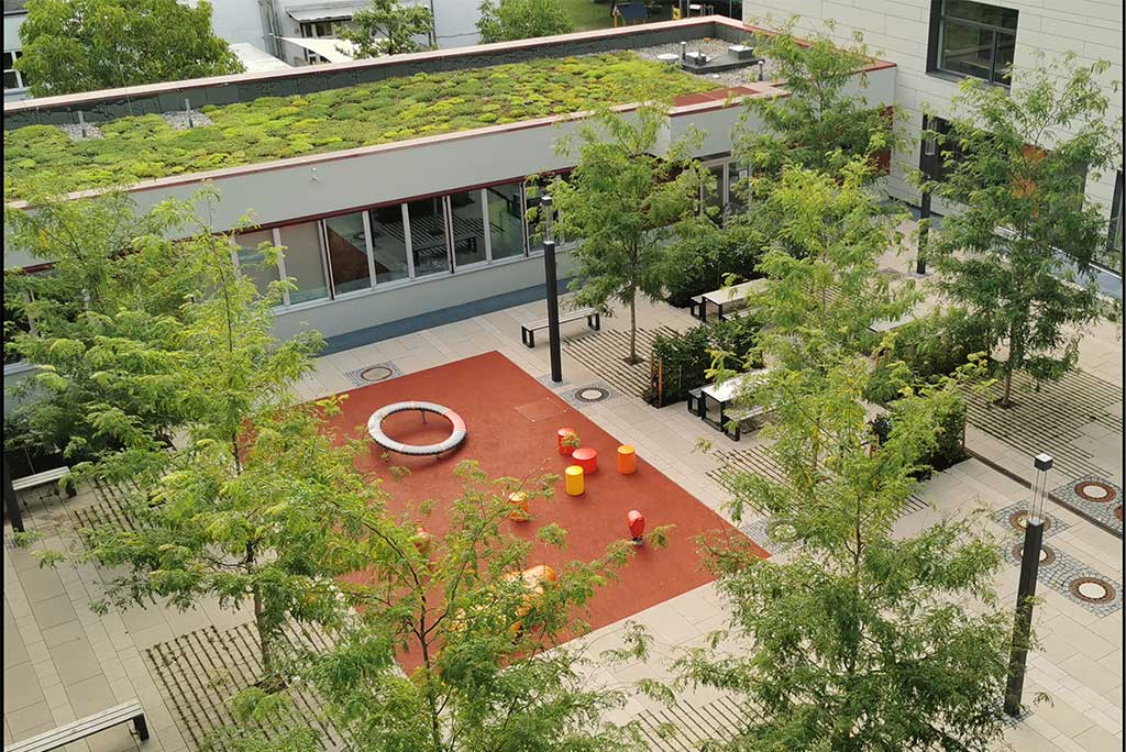 Im Pausenhof 1 beschatten neu gepflanzte Gleditschien die Fläche, ein kleines Spielfeld aus Elastikbelag mit einigen Spielgeräten animiert zur Bewegung. Die nachhaltig aufgearbeiteten Sitzmöbel ordnen sich zu Ruhezonen an. Ein Baumblock aus Robinien bildet das grüne Zentrum von Pausenhof 2. Bunte Sitzmöbel und ein Spielfeld beleben die Fläche, der Lichtgraben wird neu bepflanzt. Der große Pausenhof beinhaltet auch die Sportflächen der Schule und wird mit neuem Elastikbelag und durch den Einbau multifunktional nutzbarer Spielfelder aufgewertet. Als Übergang zum vorhandenen „Wellenmeer“ entsteht ein Klimawäldchen als Schattenspender. Alle Pausenhöfe erhalten neue Beläge.