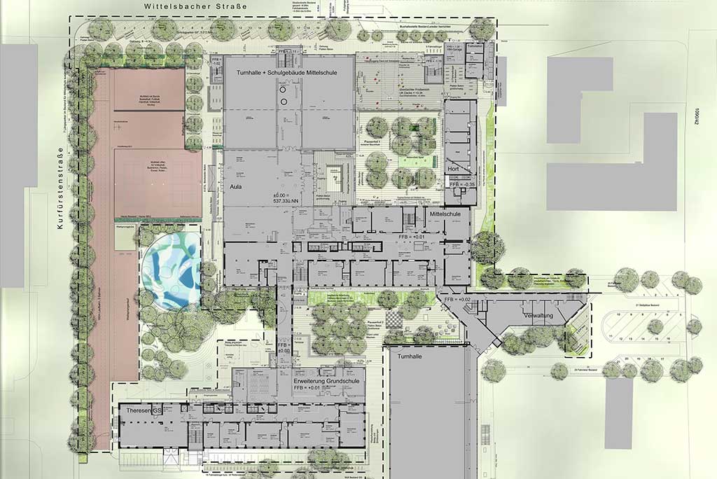 Neuplanung der Eingangssituation und der Wittelsbacher Straße, mit dem Ziel einen Schulvorplatz zu schaffen. Die Straße wird verengt und es entstehen baumüberstandene Schrägparkplätze und Fahrradstellplätze.